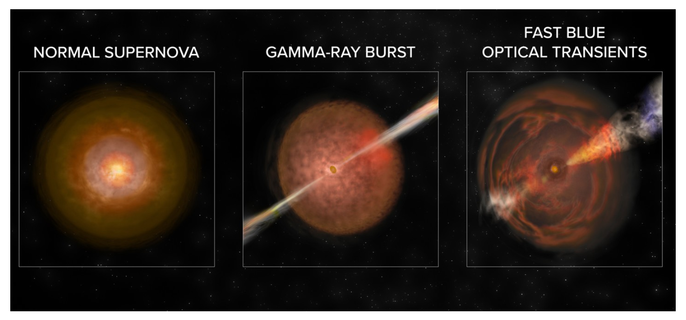 乍一看,FBOTs似乎与其他瞬态空间事件类似,如伽马射线暴、快速射电波(FRBs)和超新星等。但这些宇宙爆炸都有不同的特征和来源。例如,FBOT比FRB的持续时间要长得多,FRB通常只有几毫秒,但比超新星的持续时间要短得多,超新星可以发光几个月或几年。FBOT还含有氢,而伽马射线暴则没有。