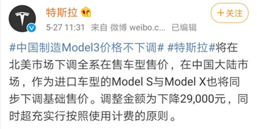 特斯拉官方微博的消息显示,将在北美市场下调全系在售车型售价,在国内,作为进口车型的Model S与Model X也将同步下调基础售价。调整金额为下降29000元,同时超充实行按照使用计费的原则。