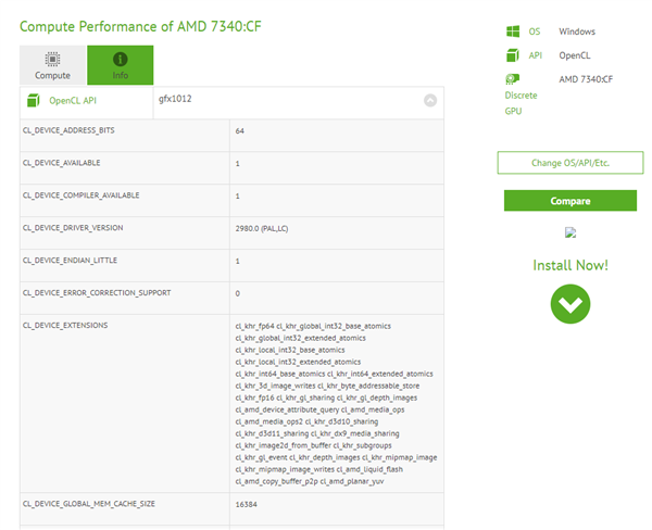关注AMD显卡的玩家肯定都在翘首以盼期待RDNA 2架构和Big Navi大核心的下一代产品,毕竟要支持光追了,能和老黄正面刚一下也有利于整个行业的发展。但殊不知,现在的RX 5000系列依然有新动作。CompuBench测试数据库里出现了一款编号“AMD 7340:CF”的显卡设备,核心代号为GFX1012,显然隶属于Navi家族,并非老架构的“马甲”。