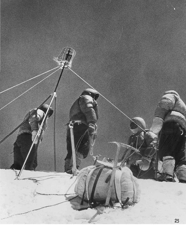 1975 年 5 月 27 日,中国首次进行珠峰高程测量。虽然当时登顶的人中没有专业的测绘人员,但有登山队员将 5 公斤重的“觇标”这一重要测绘仪器带上了珠峰峰顶。