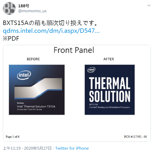 在 LGA115x 产品开售的时候,英特尔曾向 DIY 零售渠道推出过一款名叫 Thermal Solution TS15A 的盒装处理器。随着十代酷睿处理器的发布,英特尔于近日向供应链发送了一条产品变更通知,表示兼容 LGA1200 插槽的新一批 TS15A 盒装散热器即将到货。