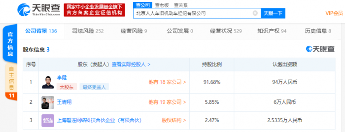 天眼查数据显示,该公司工商披露的股东中,最大股东为人人车创始人兼CEO李健,持股比例为91.68%,第二大股东为人人车联合创始人王清翔,持股比例为5.85%,第三大股东为上海磐连网络科技合伙企业(有限合伙),持股比例为2.47%。