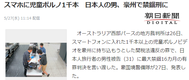 手机里存着宝贝片片没事就不要乱出国,5月27日今天澳大利亚边境警备队宣布,26日法院已经判决一名手机存大量色情视频入境的日本男子有罪,最大获刑达16个月。