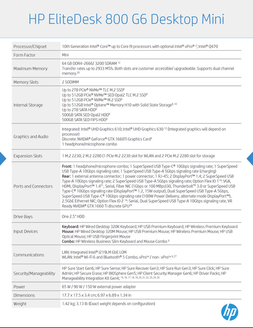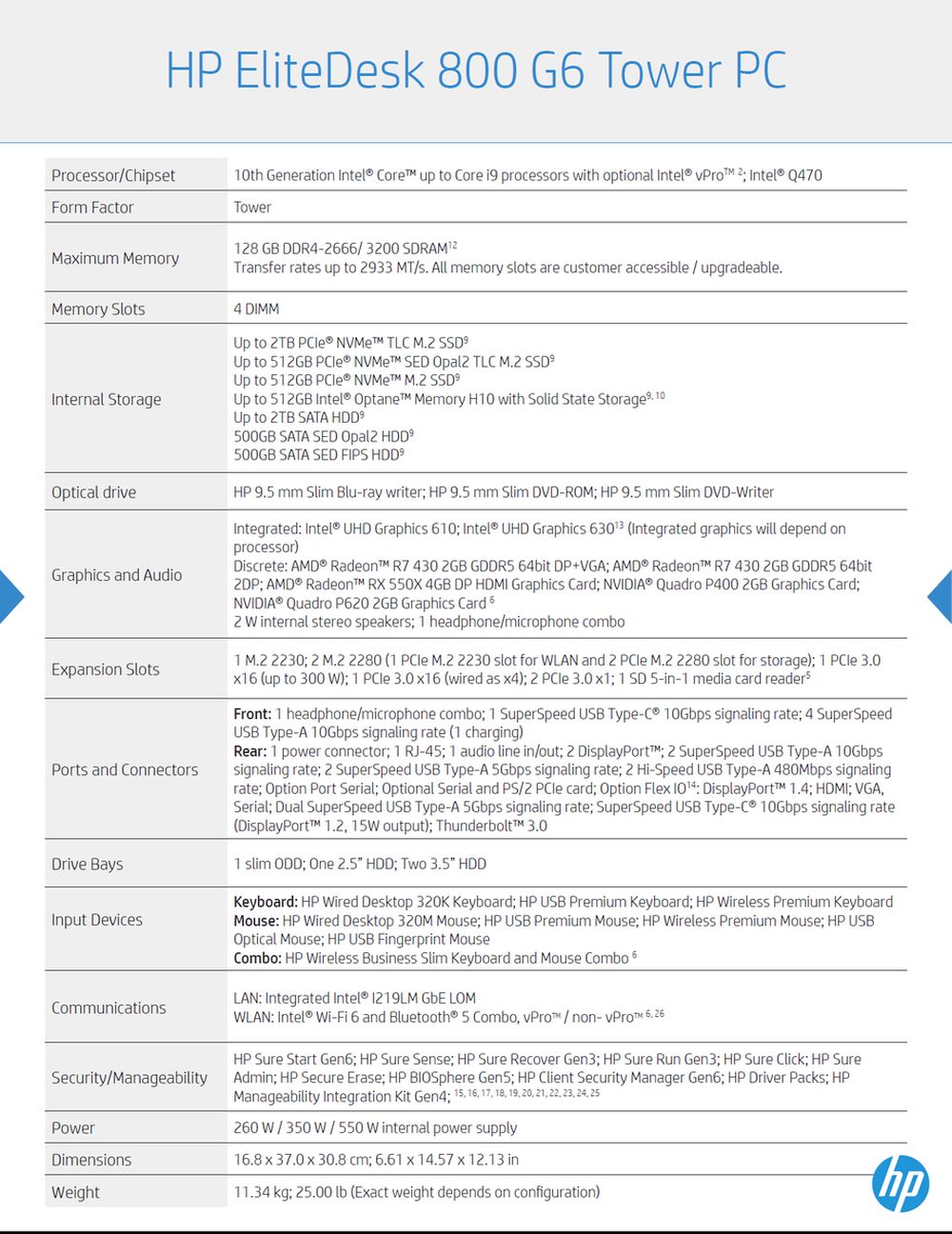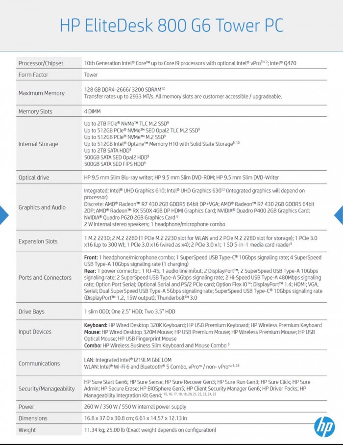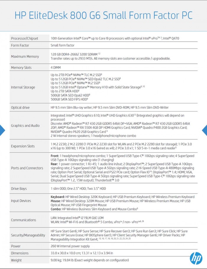 惠普EliteDesk 800 G6小尺寸台式机(SFF)PC现在配备了可选vPro功能的Comet Lake-S酷睿i9 125W处理器,4个硬盘托架和4个半高的插槽--包括两个支持双GPU的插槽。