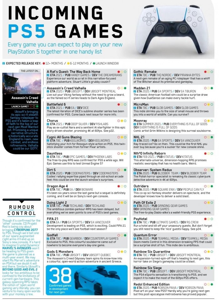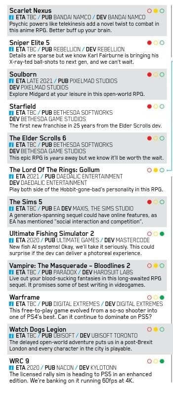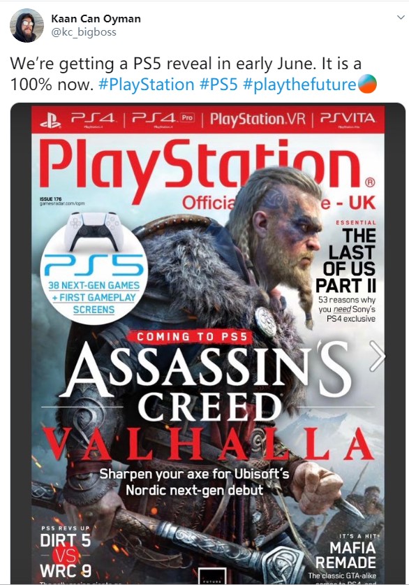 据推特主Kaan Can Oyman透漏,PS官方杂志表示将于6月展示38款PS5游戏,根据推特评论区的截图我们可以看到很多大作,如《战地6》、《尘埃5》、《FIFA 21》、《上古卷轴6》等,详细如下图: