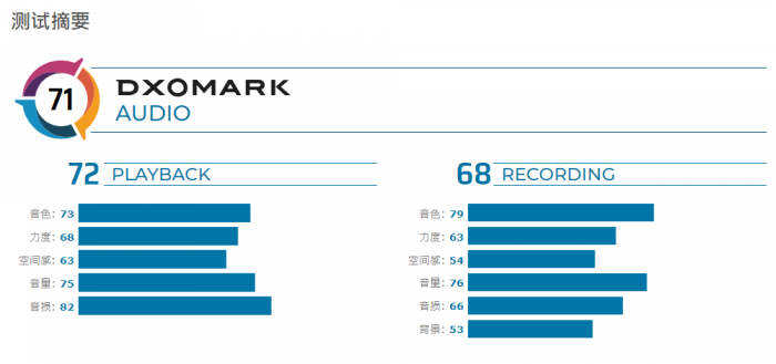 子项分数上,播放分数72分,录制分数68分。DxOmark认为,iPhone 11的音色和音损分数比Pro Max高,而Pro Max则在空间感和音量方面胜过iPhone 11。