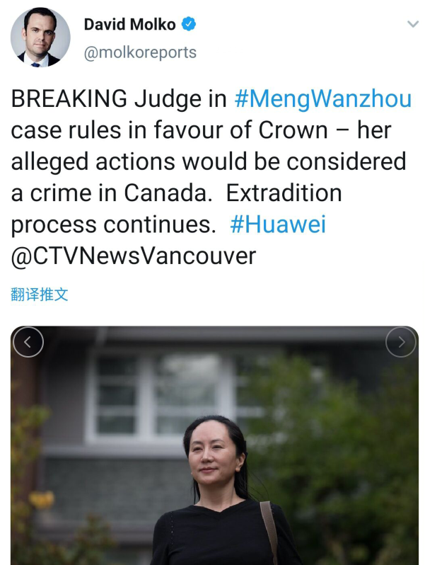 2020年5月27日,周三,英属哥伦比亚省高等法院女法官海瑟·霍尔姆斯在当地时间上午10点开庭,就当事人双方当前争议的焦点问题——美国的引渡请求是否满足“双重犯罪”标准——做出裁定,11时,裁定向外界公布:引渡请求达到“双重犯罪”标准。引渡进程迎来自2018 年底启动以来的第一个转折点:辩方该回合落败,不得不在孟晚舟继续被羁押的条件下进行下一步的抗辩。