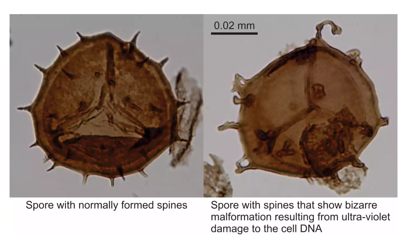 结果发现,许多孢子的颜色比预期的要深,表面上长出了不寻常的刺。据研究小组称,颜色的变化很可能是对紫外线辐射过量的保护反应。这种波长的辐射也可能破坏了孢子的DNA,引发了异常刺的生长。但是,那么如此破坏性的紫外线辐射是如何到达地球表面的呢?研究小组认为,臭氧的破坏是地球气候周期的一个自然部分,而不是强烈的火山喷发造成的异常。