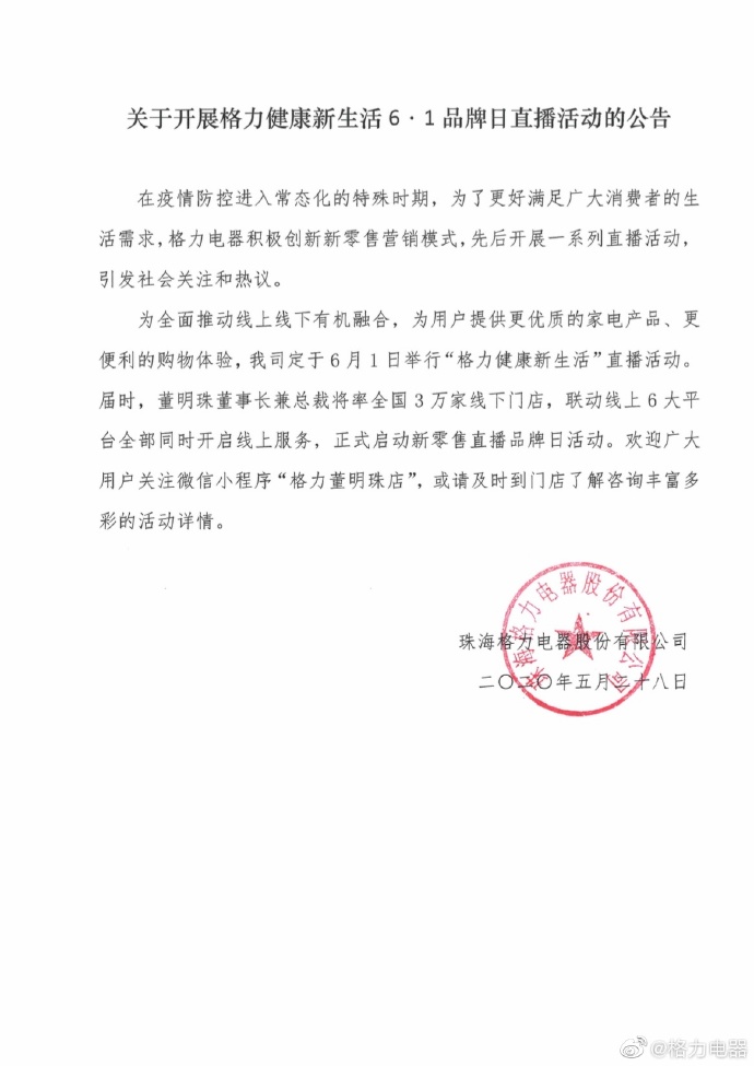 为全面推动线上线下有机融合,为用户提供更优质的家电产品、更便利的购物体验,我司定于6月1日举行“格力徤康新生活”直播活动。届时,董明珠董事长兼总裁将率全国3万家线下门店,联动线上6大平台全部同时开启线上服务,正式启动新零售直播品牌日活动。欢迎广大用户关注微信小程序“格力董明珠店”,或请及时到门店了解咨询丰富多彩的活动详情。