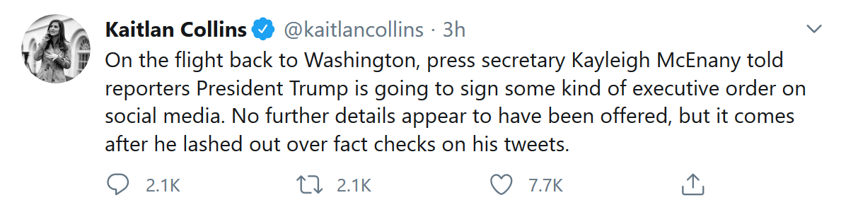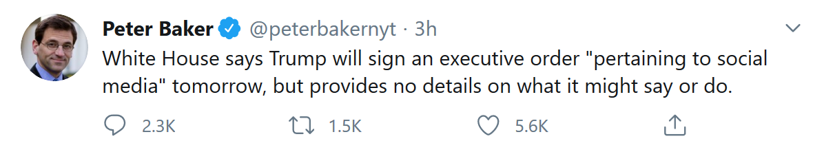 当地时间周三早些时候,特朗普在Twitter上发文称,Twitter“现在已经证明,我们关于他们(以及他们的其他同胞)所说的一切都是正确的”,“重大行动”将随之而来。虽然他没有具体说明将采取什么行动,但《纽约时报》、PBS和CNN的白宫记者周三都在Twitter披露称,总统将于明天(周四)签署一项跟社交媒体有关的行政命令。