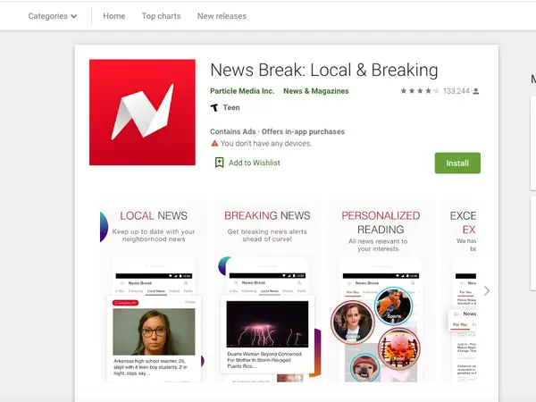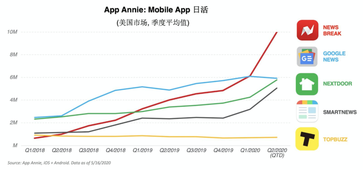 目前,News Break 已成长为拥有千万日活用户的硅谷准独角兽公司,长期在美国 App Store 及 Google Play 新闻类排名第一,移动用户数超过了 CNN、福克斯新闻台,《纽约时报》等老牌新闻媒体的移动客户端,覆盖全美两万多个城市,加盟的美国媒体和内容创作者超 1 万多家。