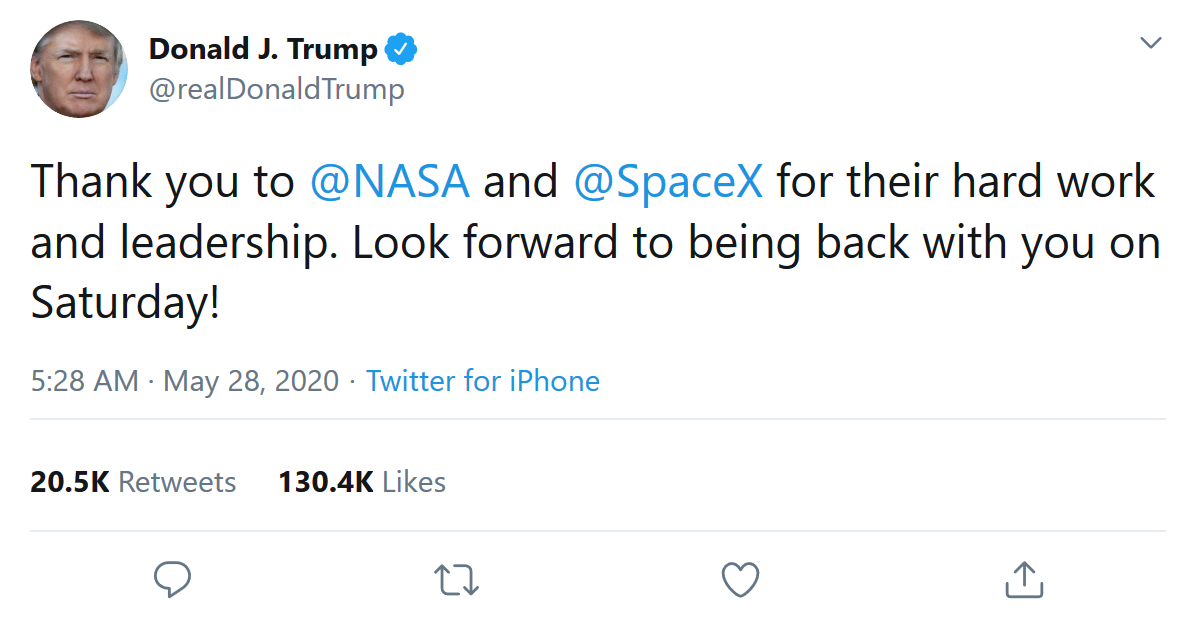 特朗普在周三参观SpaceX的设施时向马斯克表示祝贺,并称他是“我的老朋友”。他取消了原定在发射现场发表演讲的计划,并在发射被取消后不久返回华盛顿。但特朗普从发推文称,他将于当地周六再次返回现场观看发射。