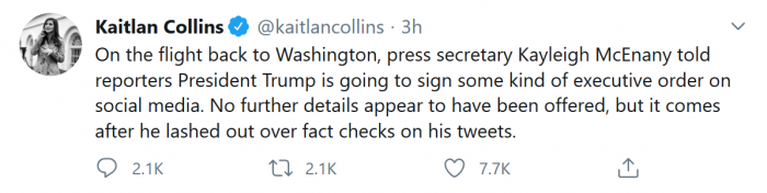 这一消息正值特朗普和Twitter“发生冲突”之际。本周二,Twitter首次对特朗普“采取行动”,将他的一系列“推文”(Twitter消息)打上了应进行“事实核查”的警示标签。周三,特朗普作出回应,声称要监管或关闭社交媒体公司。