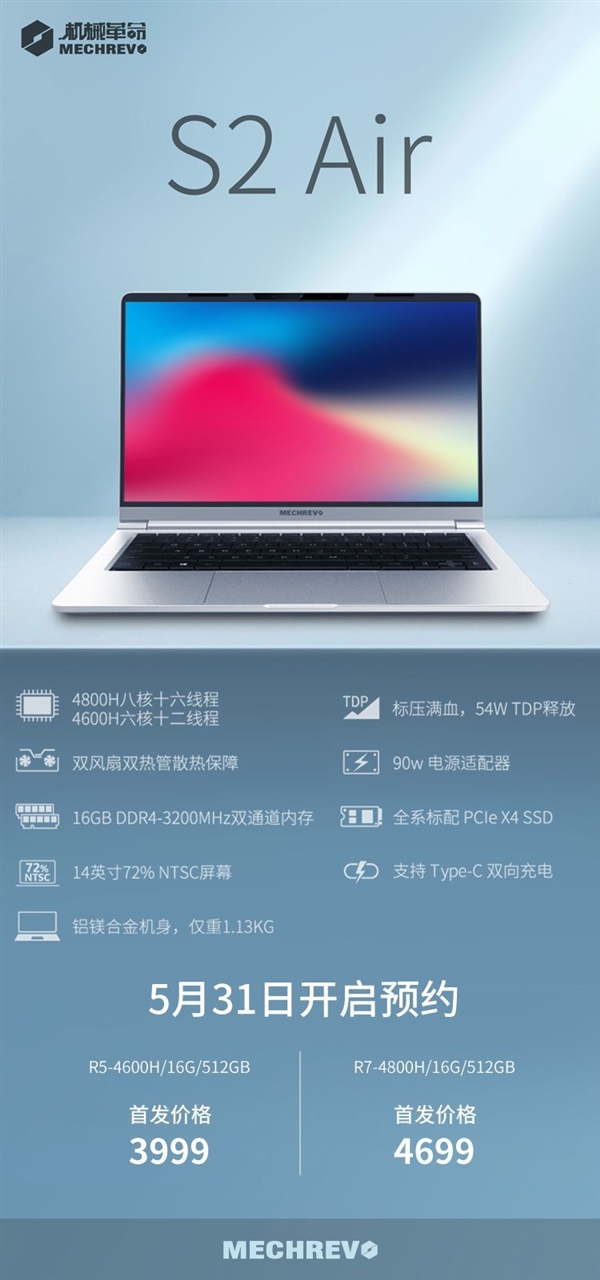 机械革命日前推出两款高性价比AMD锐龙4000标压本,分别是主打轻薄的S2 Air和面向程序员的Code 01,定于5月31日和29日开启预售。S2 Air采用铝镁合金金身,仅重1.13kg。基本配置方面,14英寸72% NTSC屏幕,AMD锐龙4600H或4800H标压满血处理器(54瓦TDP释放)。16GB DDR4-3200双通道内存,全系标配PCIe x4 SSD,双风扇双热管,支持USB-C双向充电,配90瓦电源适配器。