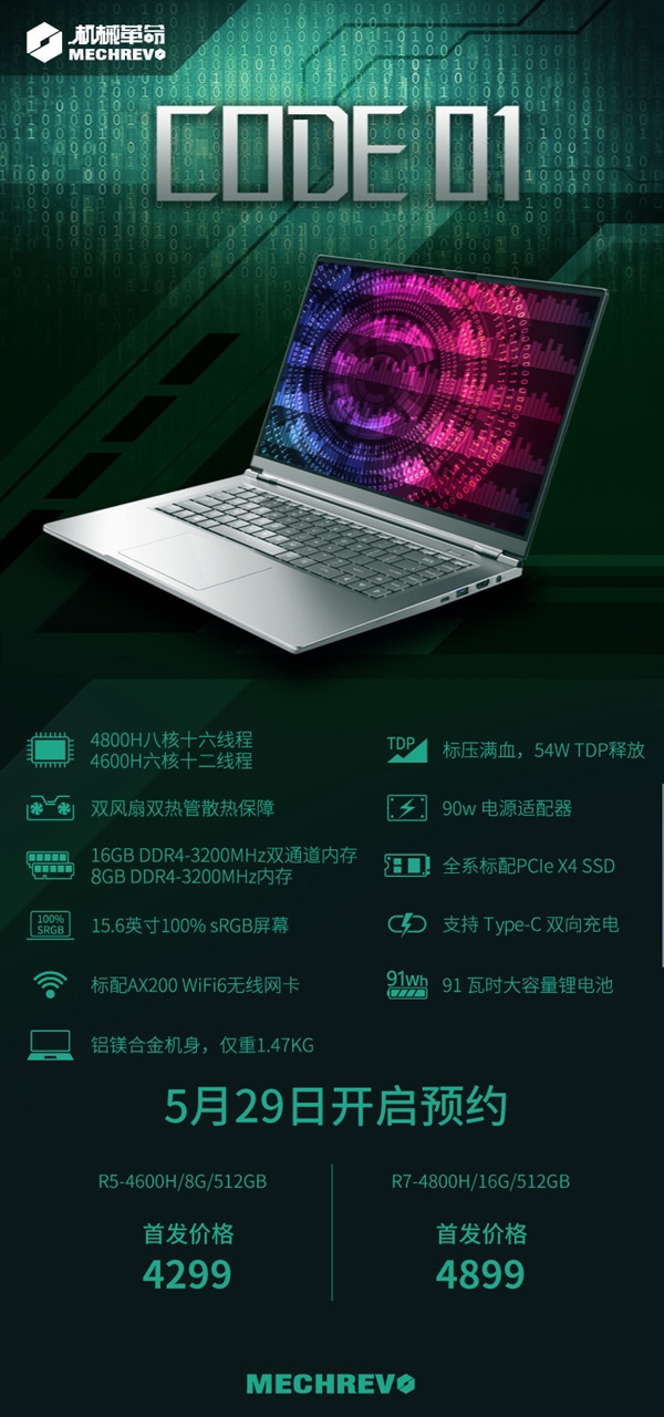 Code 01升级为15.6英寸100% sRGB屏幕,同样铝镁合金机身,1.47Kg重,标配AX200 Wi-Fi6网卡,91瓦时电池,R5-4600H/8G/512GB定价4299元,R7-4800H/166G/512GB定价4999元。