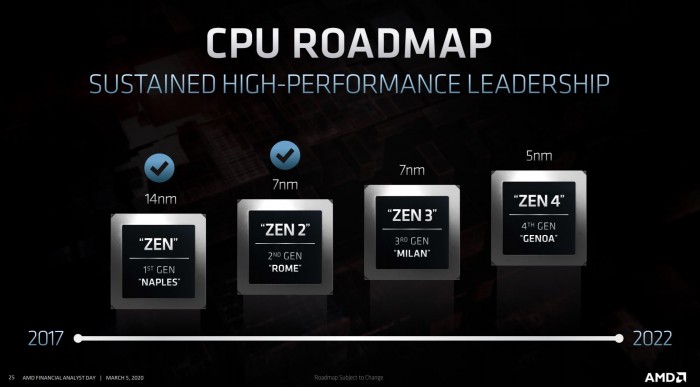 今日传来台积电将于今年四季度量产5nm+(5nm增强版)的消息,没想到,更进一步的爆料指出,AMD似乎决定改变第四代锐龙处理器(Vermeer,维米尔)关键制程工艺。AMD早先公布的路线图显示,AMD Zen 3家族产品基于7nm工艺打造,明年的Zen 4才会升级到5nm,不过因为进展异常顺利,AMD的第四代锐龙将直接升级到5nm+。