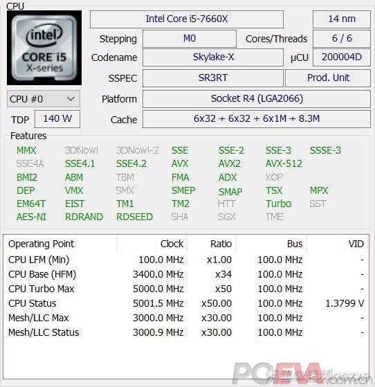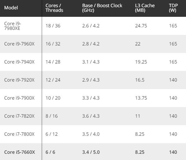 这颗i5-7660X就更奇葩了,是Intel历史上第一颗发烧级的i5,6核心6线程,基准频率3.4GHz,睿频加速高达5.0GHz,是整个家族中最高的,简单地说就是i7-7800X屏蔽超线程、调整频率的产物。