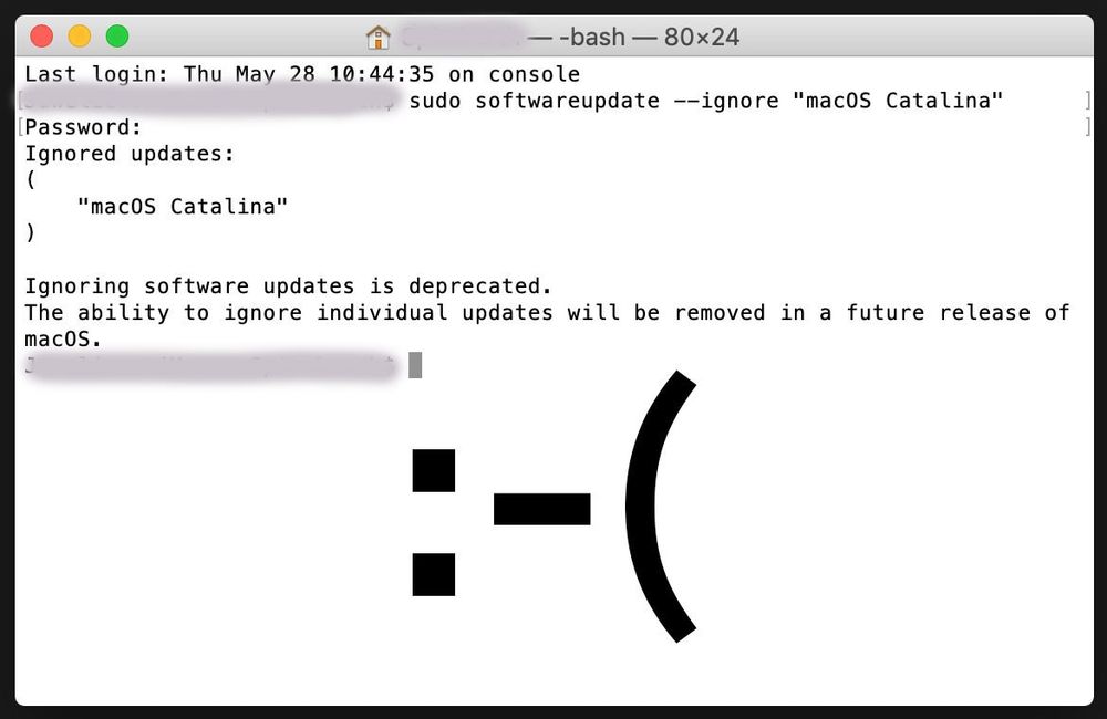 对于仍然运行macOS Mojave和macOS High Sierra这样旧版macOS系统的用户,系统偏好设置中的系统更新通常会显示可用的安全更新,但是对于精通macOS的用户可以在终端中使用“softwareupdate --ignore "macOS Catalina"”命令来隐藏这些通知。