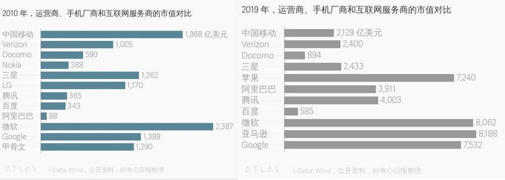 移动通信产业本来就是一条很巨大的食物链,成份相当复杂,自智能手机出现后,整个移动产业链更出现大洗牌。从上图可见,下游互联网(Google)和手机终端产业(苹果)都在轻松吃肉,而上游的运营商(中国移动)和网络基础设备产业(诺基亚)只能辛苦地啃骨头。