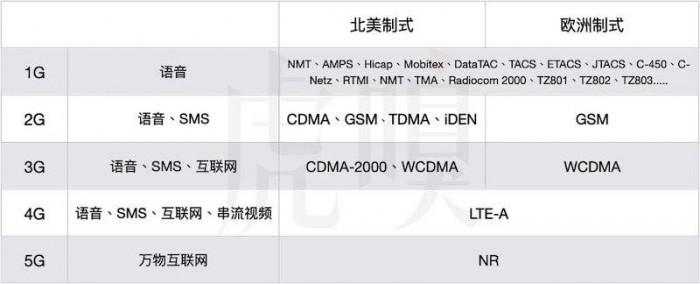 不同年代的移动通信制式,注意 CDMA 和 TDMA 为俗称,该制式的正式名称为 cdmaOne 及 D-AMPS