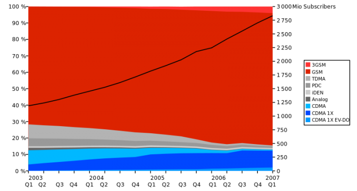 2003 年起各个不同制式的全球市场份额,左轴是占有率,右轴是用户数量。图片来源:维基百科