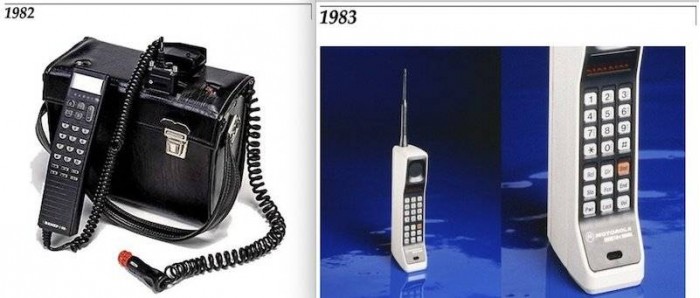 这台机器是全球的第一台真正的手机,这也是全球第一次“真正的手机通话”——当时欧美国家虽然有移动电话,但全像台式电脑一样笨重(下图左)。10 年后,这台名叫 DynaTAC 的手机(下图右)正式上市,这也是第一代的移动通讯系统——1G 制式的正式登场。