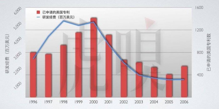 朗讯的研发经费与已申请的专利数。数据整理自 The Rise and Demise of Lucent Technologies
