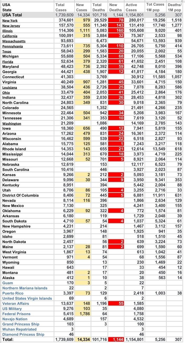 目前美国新冠病毒确诊用户数量超过170万,死亡人数超过10.2万,而其中很大一部分都是来自于17个试图复工的州。根据CNN本周三报道,目前已经确定会疫情重灾区的地方包括加州、纽约、伊利诺伊州和德克萨斯州,每个州都出现的大量确诊人员激增,每日新增新冠确诊患者超过1000例。