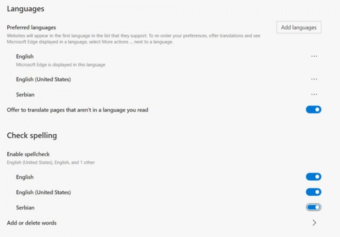 该拼写检查功能在Edge新版中默认启用,Windows的首选语言设置将在浏览器中自动继承。您可以导航到 edge://settings/languages 页面,以便配置所有在您输入时将被拼写检查的语言。此外,您还可以通过导航到 "时间和语言">"语言 "并选择 "添加首选语言",在Windows设置中安装其他语言进行拼写检查。