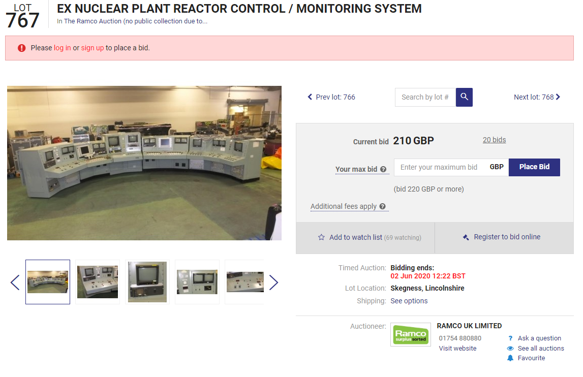 这个核反应堆控制面板目前的出价在210英镑左右。拍卖将持续到6月2日。目前无法获取有关拍卖的其他信息。