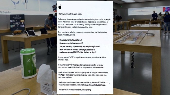 如果四个问题中有回答“是”,那么即使佩戴口罩也不会让你进入。如果回答“不是”,那么苹果工作人员会对你进行体温检查。苹果公司向顾客保证,数据不会被记录下来。