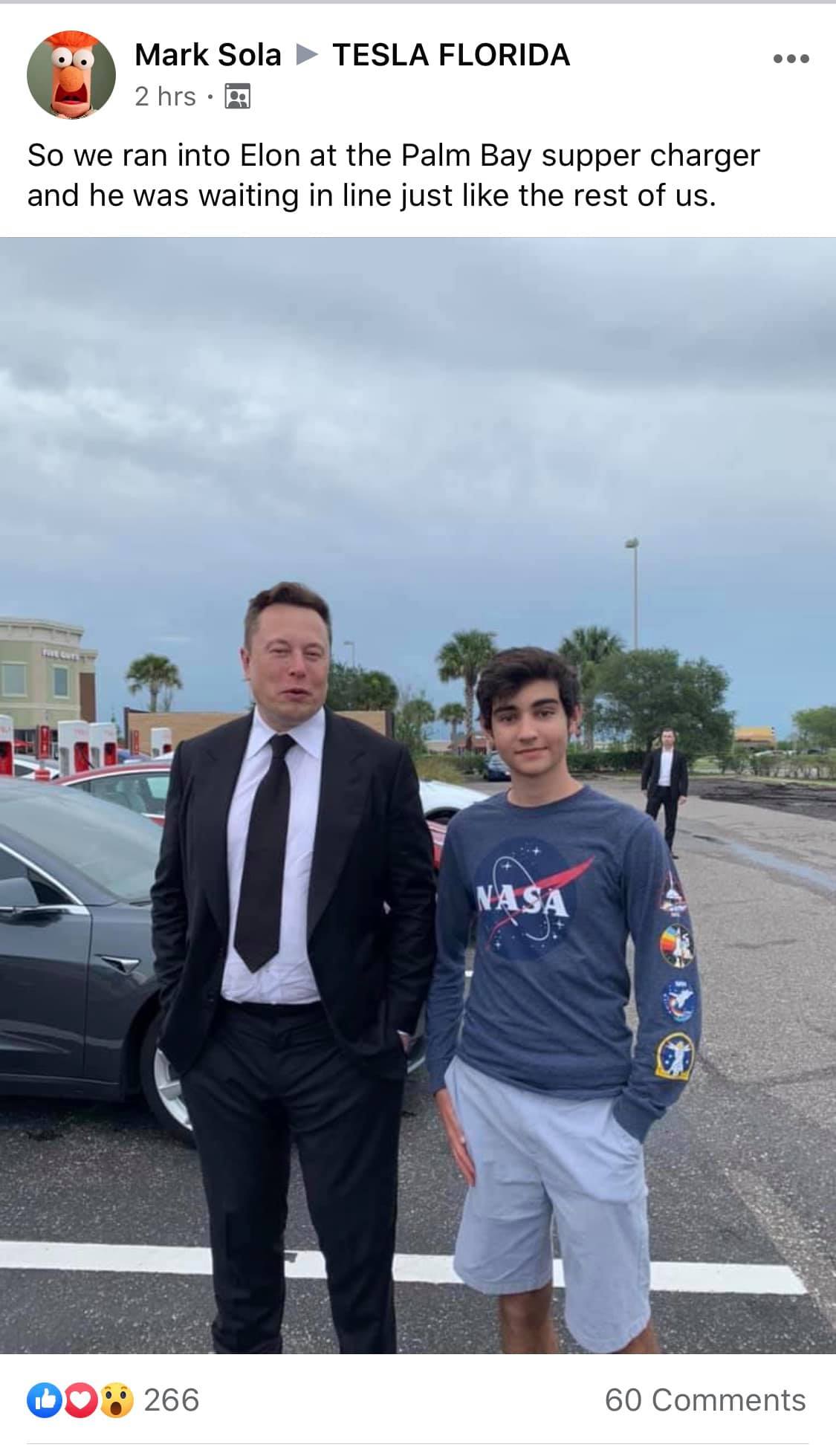 社交媒体上出现的照片显示,马斯克是在SpaceX龙飞船首次载人发射任务取消之后不久,就现身佛罗里达州墨尔本西部的一个特斯拉超级充电站。这一超级充电站,距离发射载人龙飞船的肯尼迪航天中心有约45分钟的车程。