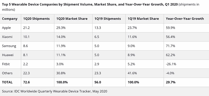 原先被认为是苹果最大竞争对手的 Fitbit,今年 1 季度只有 220 万的出货量,份额也跌至 3% 。该公司在 2019 年末宣布将被谷歌收购,该交易有望在今年晚些时候完成。