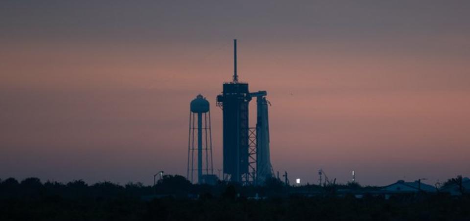 载人龙飞船与猎鹰9号火箭矗立在肯尼迪航天中心的发射台上。