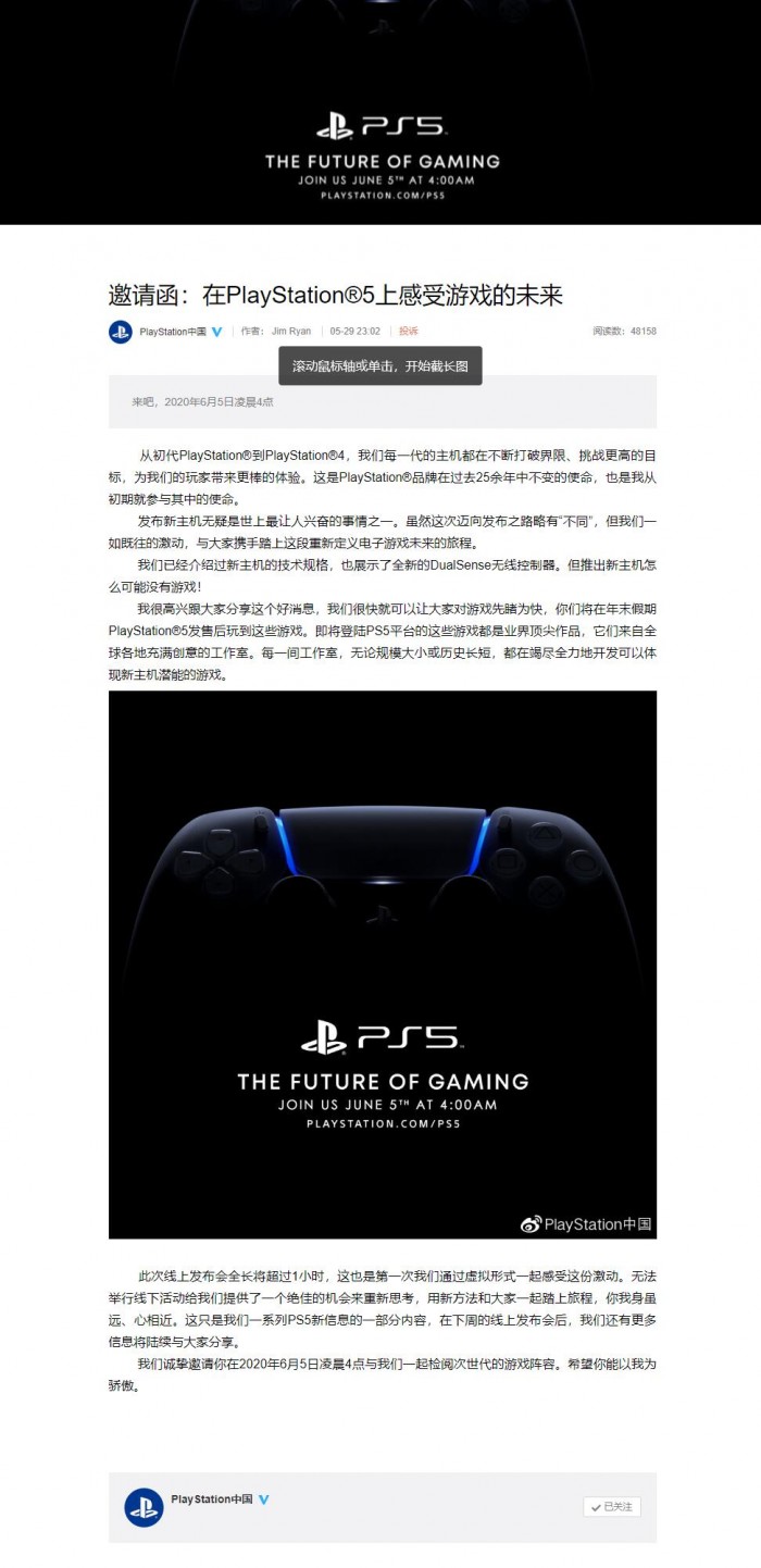 PlayStation中国官方微博日前公布消息:2020年6月5日凌晨4点,在PlayStation5上感受游戏的未来。官方公布了详细的邀请函,原文由高管Jim Ryan撰写:从初代PlayStation到PlayStation 4,我们每一代的主机都在不断打破界限、挑战更高的目标,为我们的玩家带来更棒的体验。这是PlayStation品牌在过去25余年中不变的使命,也是我从初期就参与其中的使命。