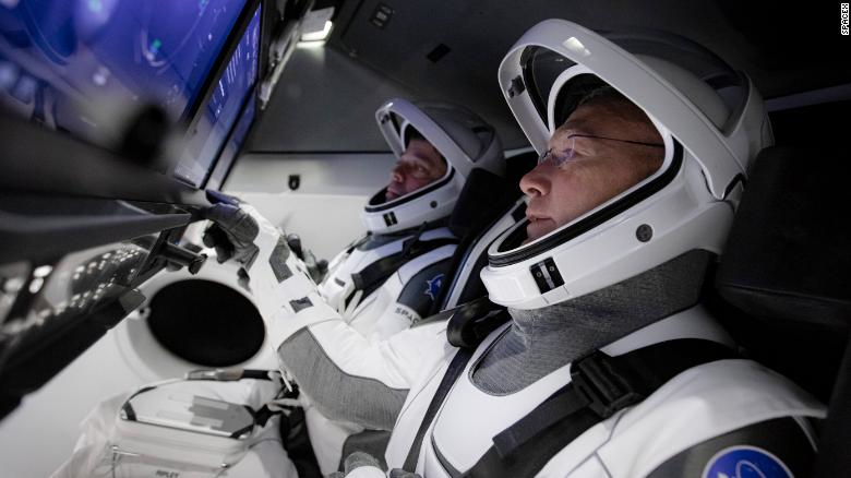 图1:NASA宇航员鲍勃·本肯(左)和道格·赫尔利准备搭乘SpaceX载人龙飞船前往国际空间站