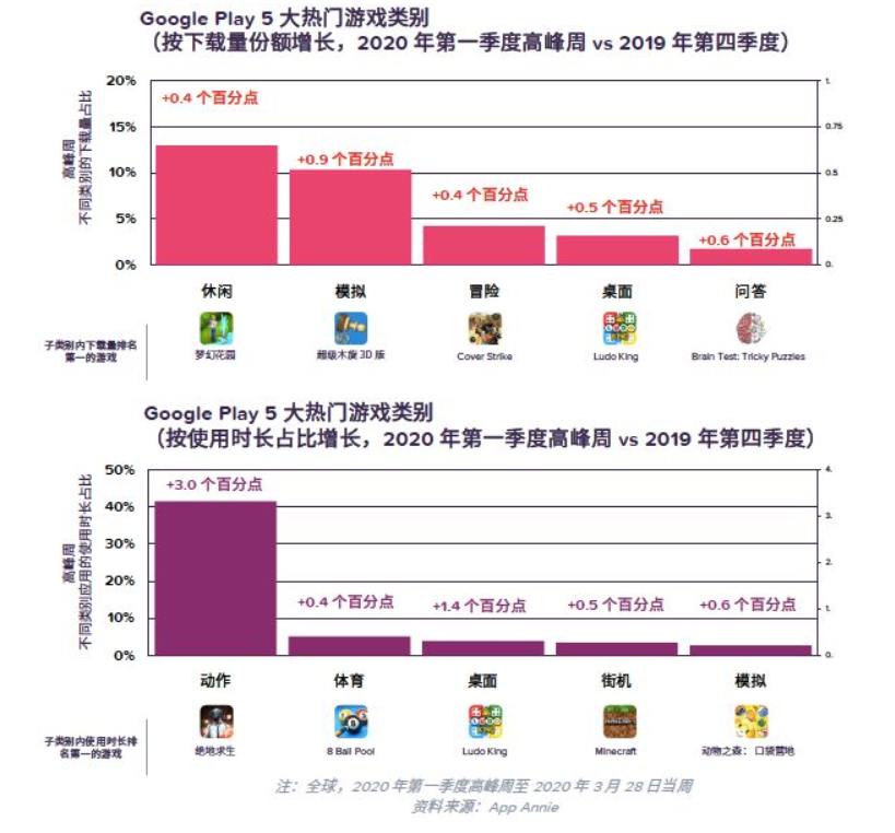 在新冠肺炎疫情期间,移动游戏的每周下载量创历史新高,达到 12 亿次。在此期间,2020 年 4 月用户平均每周下载的移动游戏比 2020 年 1 月多出 30%,在 3 月也达到了 35% 的最高增长峰值。模拟和桌面游戏的下载量和使用份额也大幅上升。