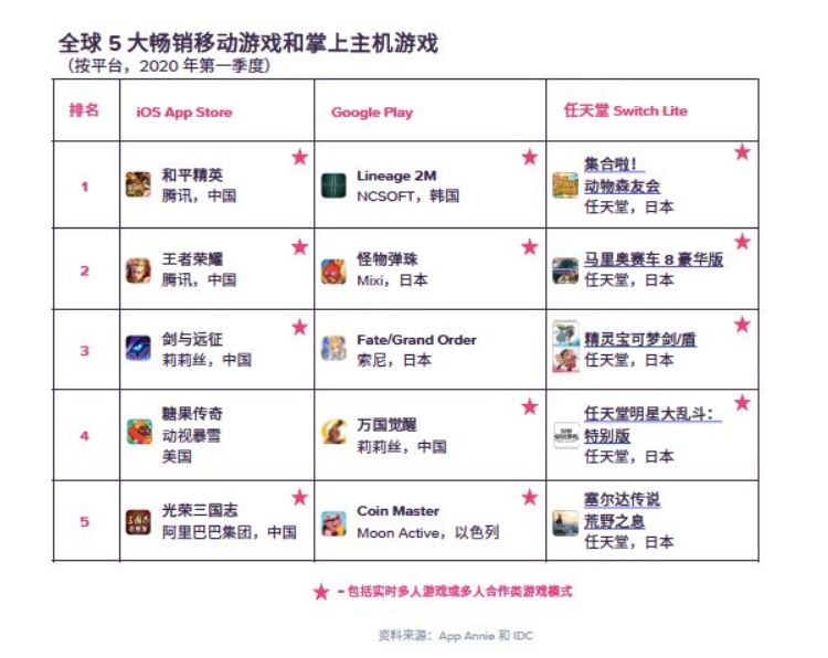 2020 年第一季度,iOS 和 Google Play 5 大畅销游戏中,有 4 款均采用了实时多人游戏玩法,这表明重度多人游戏体验不仅在移动设备上可行,而且深受用户欢迎,盈利前景相当可观。其中,中国发行商的表现可圈可点。iOS的畅销游戏的五款游戏中,国产游戏占据四席,包括分列前三位的《和平精英》、《王者荣耀》、《AFK Arena》,以及第五位的《光荣三国志》(Sangokushi Strategy)。莉莉丝的另一款游戏《万国觉醒》在Google Play的畅销榜单中排名第四。