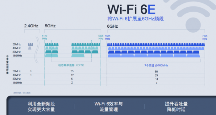 随着连网设备数的增加,5GHz频段的资源也将变得有限。此时就需要频谱资源更宽的6GHz,它最大可以承载7个非重叠160MHz信道,有了这么宽的信道和这么多非叠加信道的支撑,就可以实现更高的速率、更低的延时、更高效的网络管理。