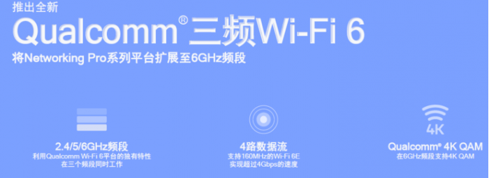 高速率的背后,除了更高频率,还需要更多技术支持。新一代的Networking Pro平台引入了高通三频Wi-Fi 6技术。三频Wi-Fi6的意思是,可在2.4GHz、5GHz和6GHz的三个频段同时工作 。据悉,高通还将5GHz划分为两个子频段,在每个频段都通过一个射频器件连接,使每个射频的信道不冲突,能连接更多的终端。