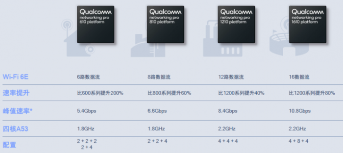 5月29日,高通发布的新Networking Pro系列平台,包括610、810、1210、1610四个平台,将Wi-Fi 6的关键特性组合扩展至6GHz频段。其中,最高规格的Networking Pro 1610平台,支持高达16路数据流的Wi-Fi 6及Wi-Fi 6E连接,采用主频为2.2GHz的四核A53处理器,8x8数据流支持更多的用户接入容量,峰值速度达10.8Gbps。