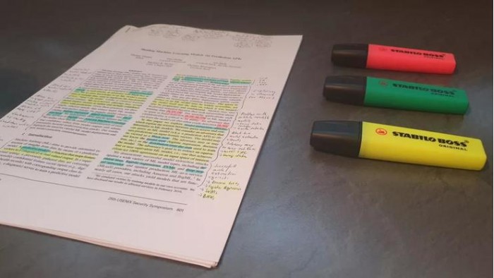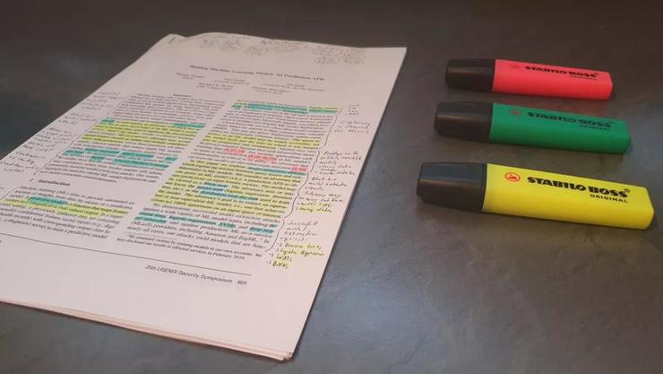 荧光笔是论文仔细阅读的灵魂,不同颜色的荧光笔可以赋予论文不同章节独特的含义。你可以用黄色画下来论文中有趣的或者重要的句子,用橙色画下来引言,用绿色画下来定义等等。但是,请记住,用荧光笔画“道道”并不能代替笔记。
