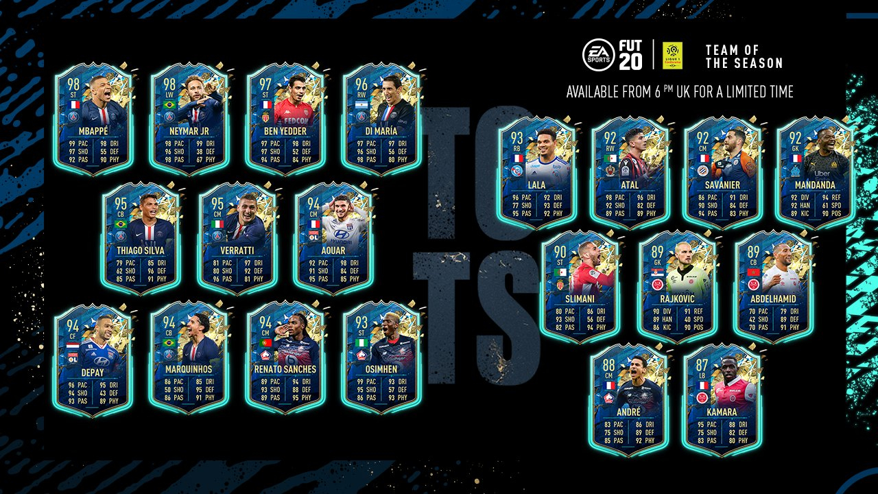 《FIFA 20》今天公布了法国足球甲级联赛的赛季最佳名单,按照惯例,这份名单中收录了各个位置上的顶尖球员。今天公布的名单中不乏世界顶级大牌球星,例如姆巴佩和内马尔。另外在当前比赛环境中占优势的维桑·本耶德尔也夺得了一张高分卡。
