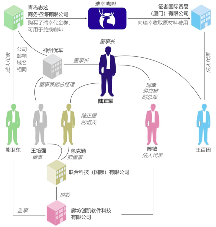 而中国内地和中国香港的公司登记记录显示,这家公司与陆正耀的一个亲戚、神州优车的一位高管,以及瑞幸的一位高管存在着千丝万缕的联系,其电话和邮箱也与神舟优车的一家分支机构相同。