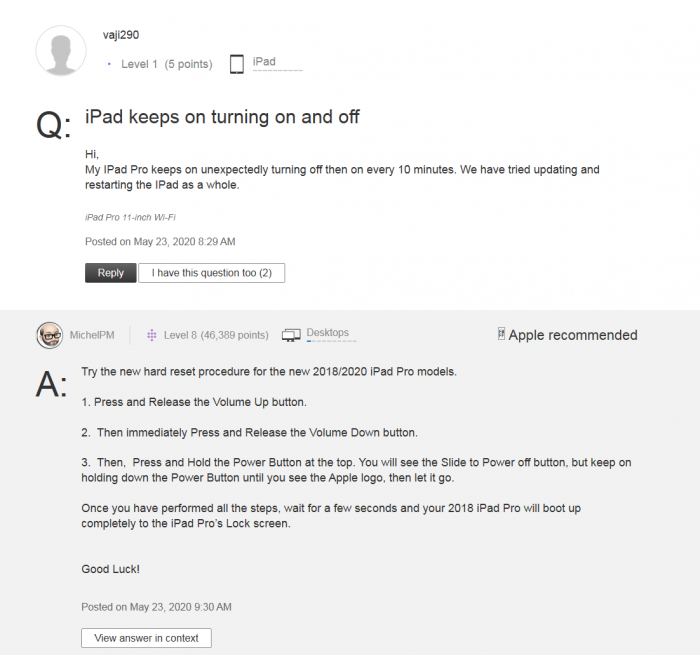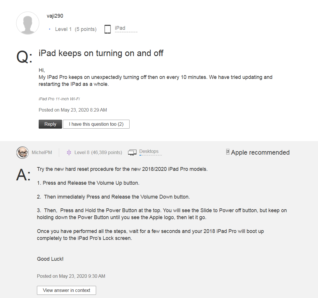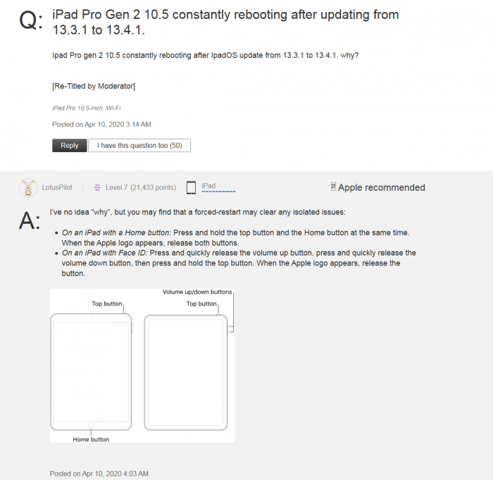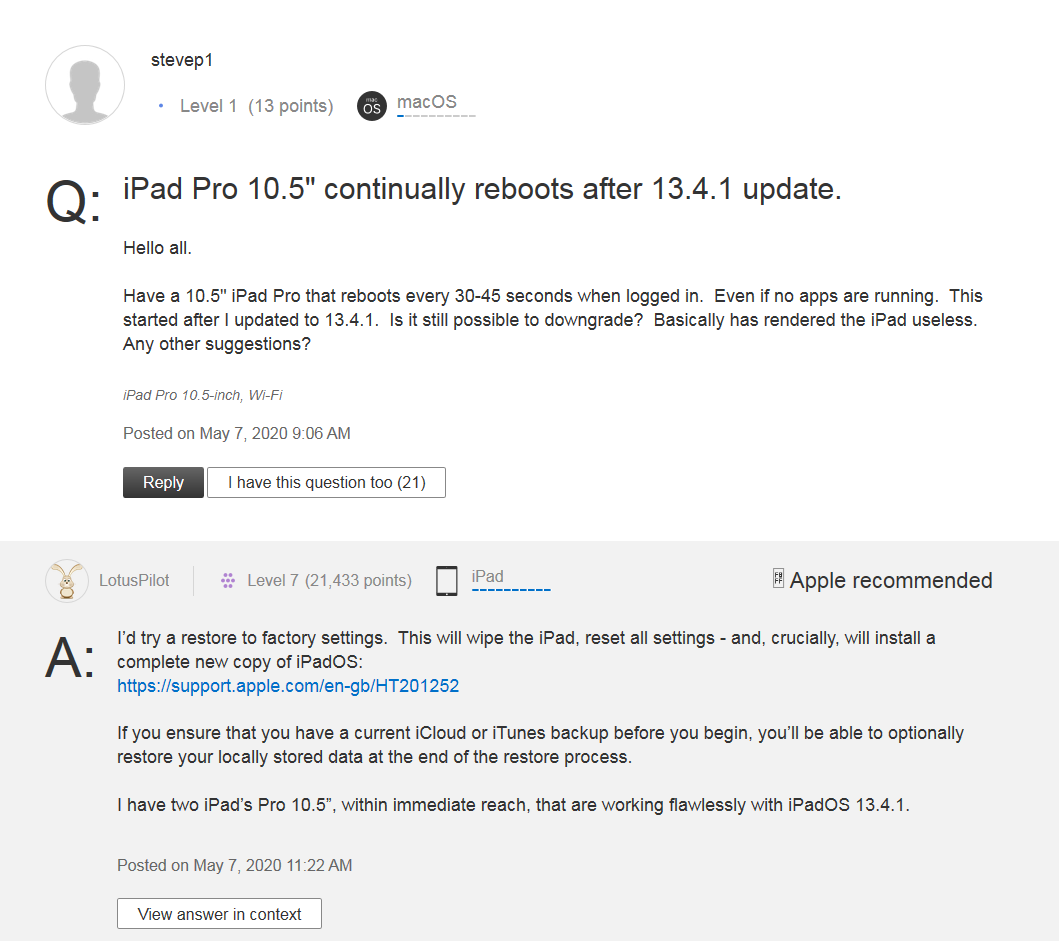 另外来自于4月10日的帖子显示了相同的问题,同样型号的iPad Pro从iPadOS 13.3.1升级到13.4.1后 "不断重启"。在5月23日的帖子中,11英寸的iPad Pro也出现了这种情况,会每隔10分钟就重启一次,表明受影响的不仅是10.5英寸机型。