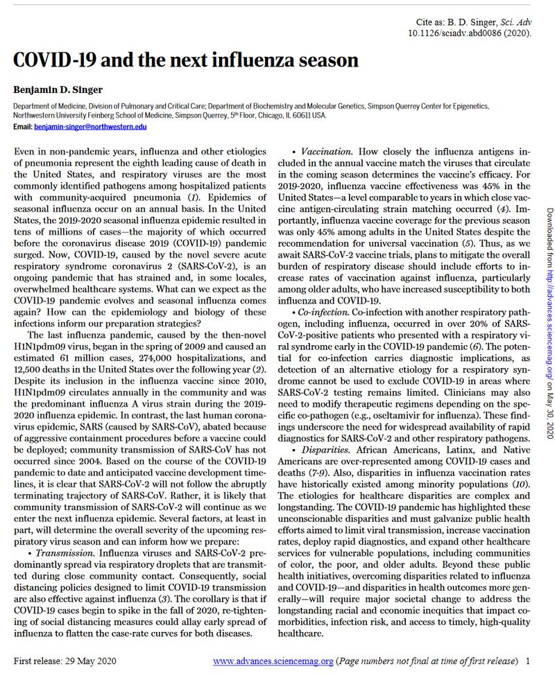 美国公共卫生官员警告称:今年晚些时候美国可能会面临第二波COVID-19新冠疫情爆发,预计将在流感季节开始前后发生。这其中牵涉到很多方面,但最为重要的是有可能会同时感染流感和新冠病毒。 近日西北医科大学的肺病专家本杰明-辛格博士(Benjamin Singer)发表了一篇新报告,详细说明了即将到来的2020-2021年流感季的严重影响程度。本次流感季的危险程度要高于以往,而是否有效实施社交隔离令会成为这两种病毒传播的关键。
