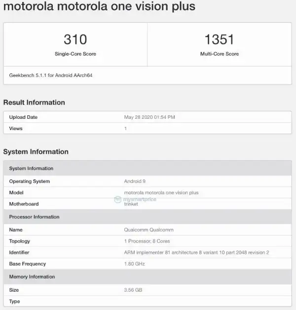 摩托罗拉One Vision Plus之前在谷歌Android企业目录中被发现,从而确认了这款手机的存在,并暗示可能很快就会发布。目前,这款手机的跑分信息已经出现在了Geekbench V5.1.1.1平台上,主要规格包括RAM、芯片组和Android版本等。