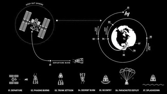 ▲飞船脱离国际空间站及返回地球过程