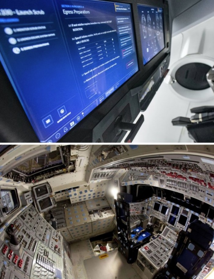 ▲上为载人龙飞船操作板,下为传统的航天飞机操作舱