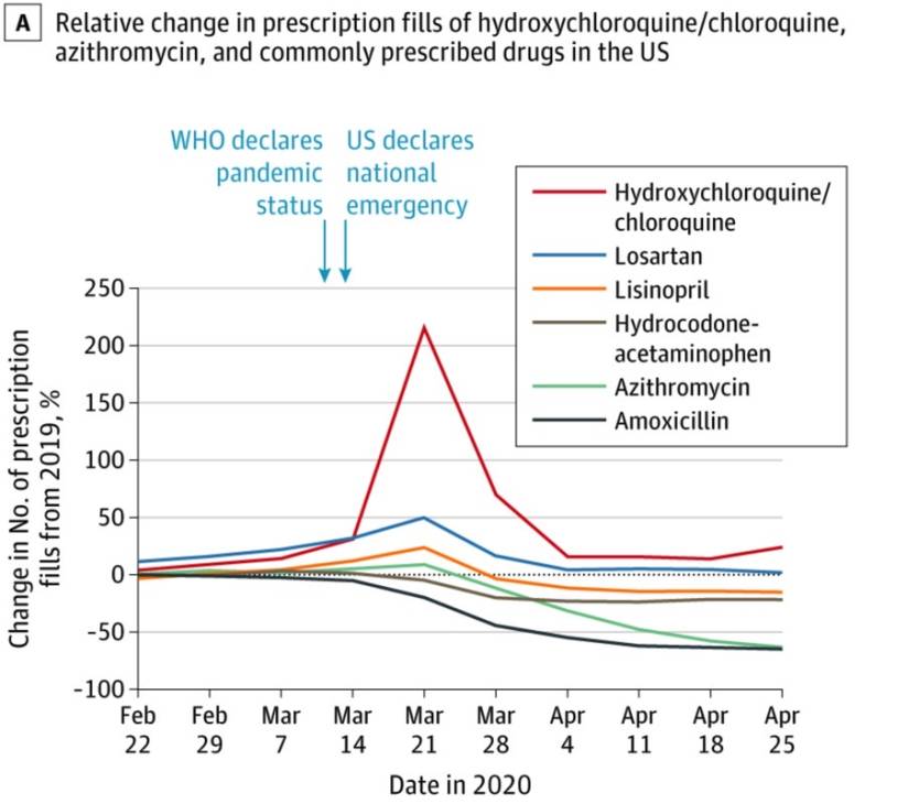 研究小组发现,羟氯喹/氯喹28片的处方量从2019年的2208个处方增加到2020年的45858个订单。这是1977%的增长。在整个10周内,与去年同期相比,有483425个过量的羟氯喹填充量。期间也出现了真正需要的患者的羟氯喹短缺。